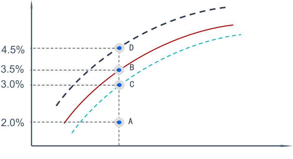构建统一的 FTP 收益率曲线框架:母线 + 融资溢价两部分组,即基于基准利率的收益率曲线做为 FTP 收益率曲线的母线,融资溢价则主要由于商业银行信用评级的差异所导致。